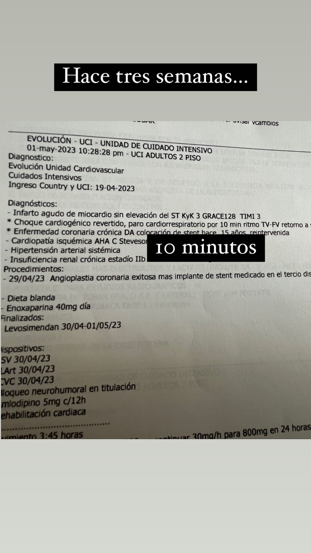En tanto que Jorge Rial remarcó la información del parte médico escribiendo sobre la imagen: "Hace tres semanas... 10 minutos".