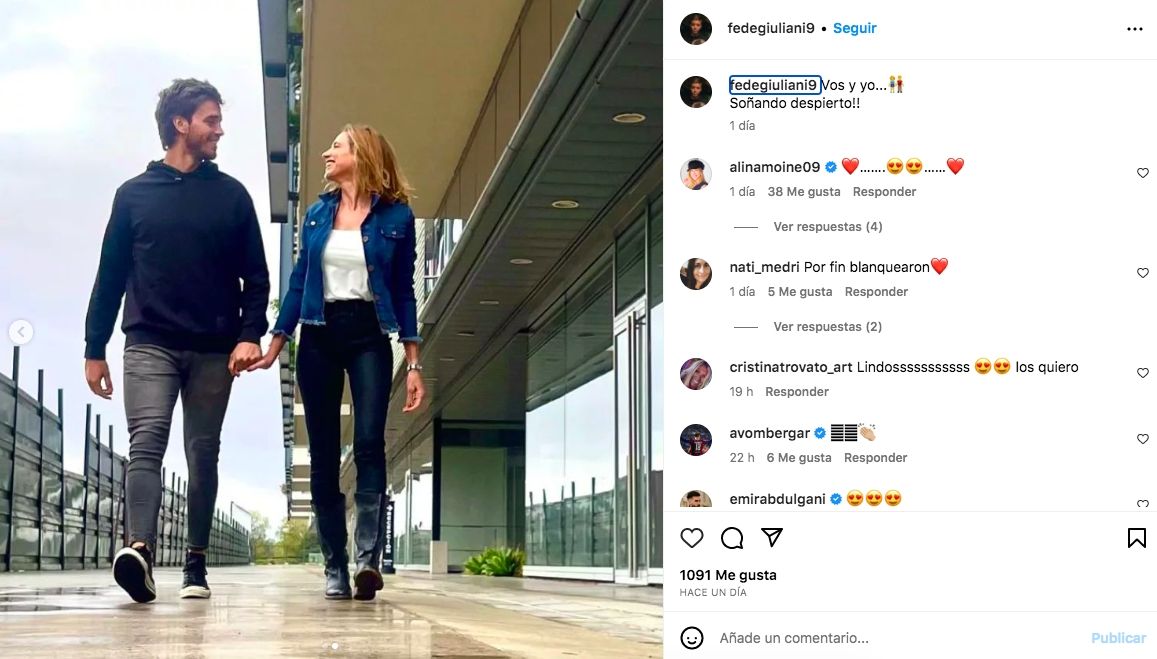 Quien confirmó el romance fue él. A través de su cuenta de Instagram publicó dos fotos donde se los puede ver caminando de la mano. "Vos y yo... Soñando despierto", escribió Federico. Por su parte, Alina respondió el posteo con unos emojis de un corazón y una carita enamorada.