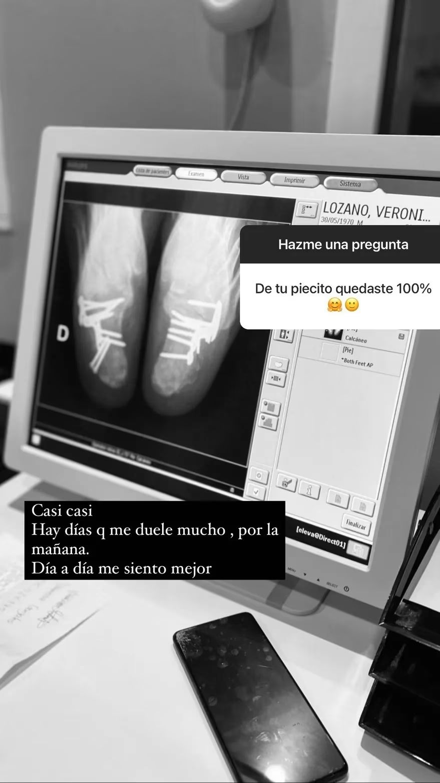 En la imagen de una radiografía que compartió Verónica Lozano, se pueden notar claramente los clavos que fueron colocados para unir los huesos de sus pies.