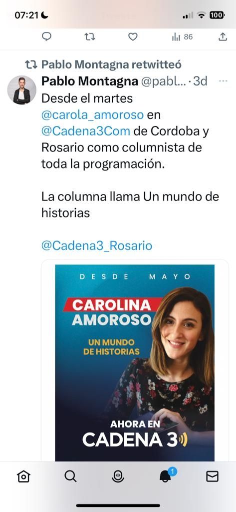 Además de sus trabajos en la pantalla de TN, la comunicadora acaba de anunciar una aventura distinta, que la llevará a incorporarse a una red muy importante del interior del país. Resulta que Carolina se acoplará a Cadena 3, el mítico medio de Córdoba.