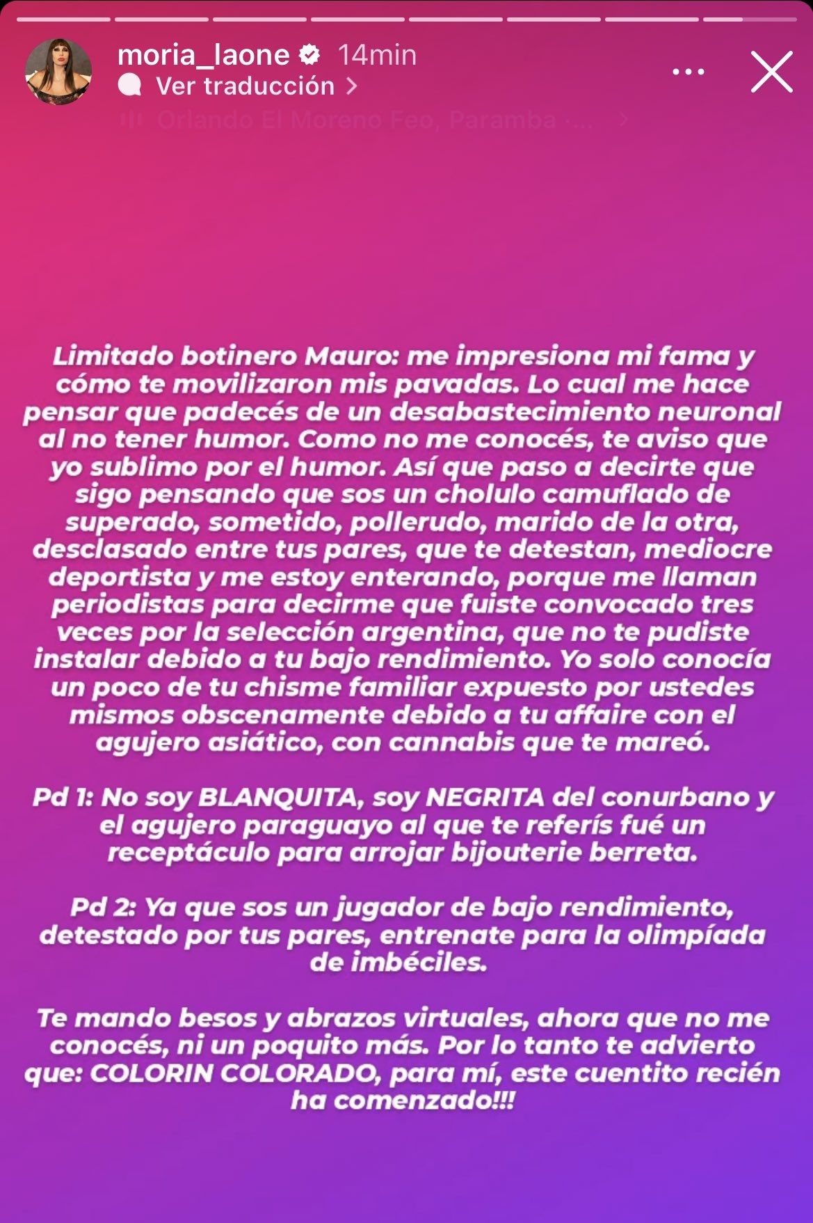 El enfrentamiento siguió creciendo y ahora la portadora de la “lengua karateka” volvió a expresarse sobre el esposo de Wanda Nara: “Limitado botinero Mauro, me impresiona mi fama y cómo te movilizaron mis pavadas”, inició Moria a través de una historia de Instagram y agregó: “Me hace pensar que padecés de una desabastecimiento neuronal al no tener humor. Como no me conocés, te aviso que yo sublimo por el humor”.