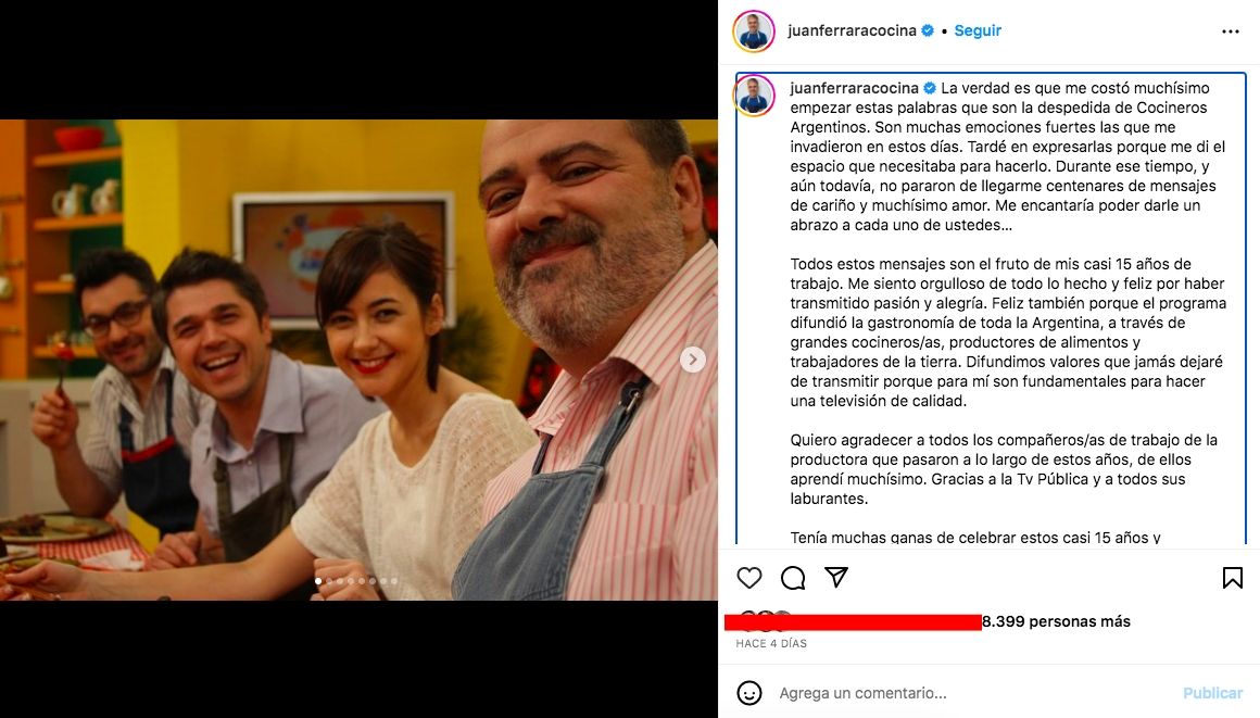 Juan Ferrara anunció hace unos días su alejamiento de Cocineros Argentinos (TV Pública). El chef compartió en sus redes sociales un extenso texto donde dio a conocer su decisión y agradeció los mensajes de cariño. "Todos estos mensajes son el fruto de mis casi 15 años de trabajo. Me siento orgulloso de todo lo hecho y feliz por haber transmitido pasión y alegría. Feliz también porque el programa difundió la gastronomía de toda la Argentina", expresó.