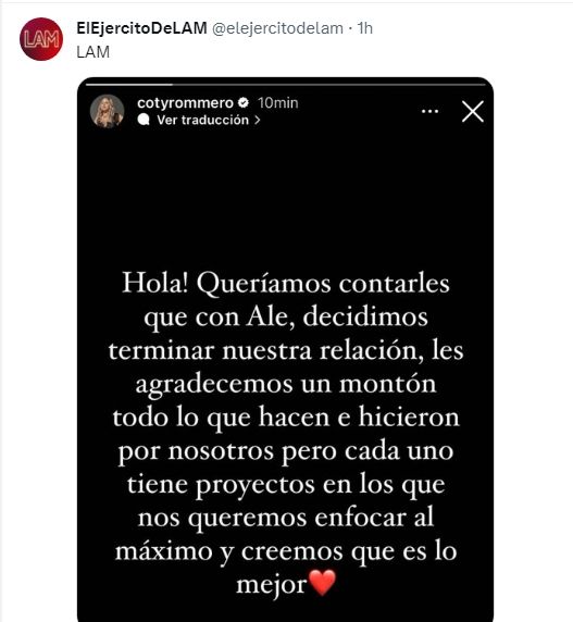"Queríamos contarle que con Ale decidimos terminar nuestra relación. Les agradecemos todo lo que hacen e hicieron por nosotros, pero cada uno tiene proyectos en los que nos queremos enfocar al máximo y creemos que es lo mejor", expresaron desde el programa de chimentos.