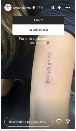 Luego un seguidor le escribió: “El que no arriesga no gana”. Ante lo cual, Julieta contestó: “Me gusta, pero no”. Finalmente, un usuario probó: “La vida es una”. Así, Poggio confirmó que esas son las palabras que se dibujó en la piel, aunque aclaró que optó por utilizarlas en el idioma francés.