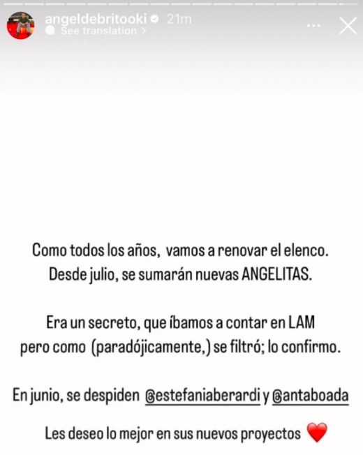 "Como todos los años, vamos a renovar el elenco. Desde julio, se sumarán nuevas ANGELITAS. Era un secreto que íbamos a contar en LAM pero como (paradójicamente) se filtró, lo confirmo", comenzó revelando el periodista.