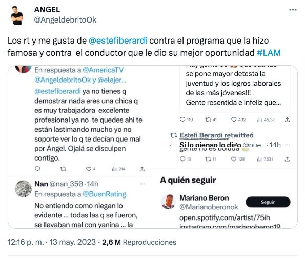 "Los rt y me gusta de @estefiberardi contra el programa que la hizo famosa y contra el conductor que le dio su mejor oportunidad", escribió de Brito junto a las capturas de los últimos retweets de Estefi. "El mismo que miró para otro lado cuando se comió el audio de Lali o mintió en el caso Bal", agregó.