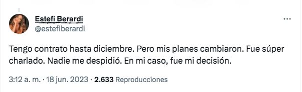 Finalmente, desde su cuenta de Twitter, Berardi contó más detalles de su desvinculación: "Tengo contrato hasta diciembre. Pero mis planes cambiaron. Fue súper charlado. Nadie me despidió. En mi caso, fue mi decisión".