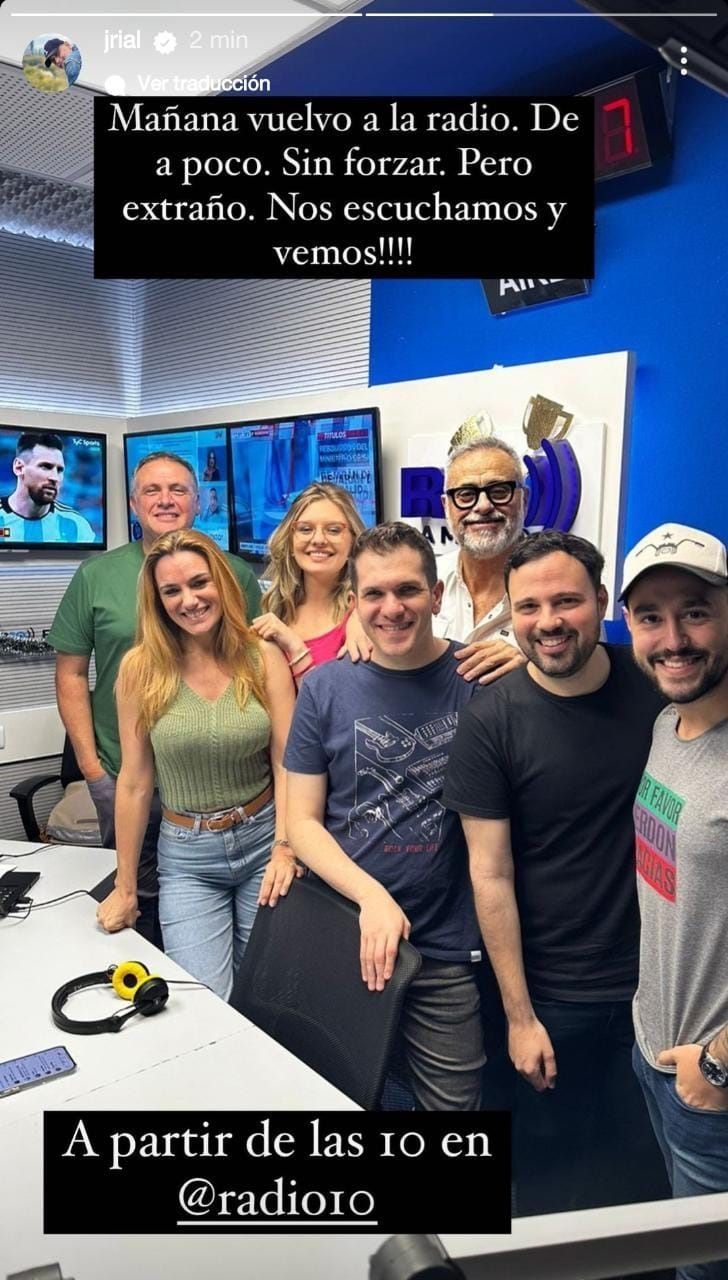 "Mañana vuelvo a la radio. De a poco. Sin forzar, pero extraño. Nos escuchamos y vemos!!!", escribió Jorge Rial sobre una foto en la que aparece junto a sus compañeros de trabajo en la radio.