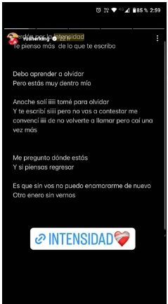 El cantante se dibujó en su cuerpo la palabra intensidad, que puede referir a su última canción, que acaba de lanzar, como a un rasgo de su personalidad. No obstante, el detalle se halla en el emoji que añadió a su storie, porque se trata de un corazón con vendas, en referencia a un proceso de sanación tras un dolor sentimental.