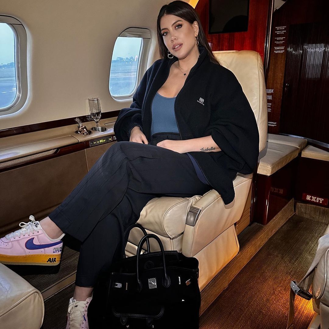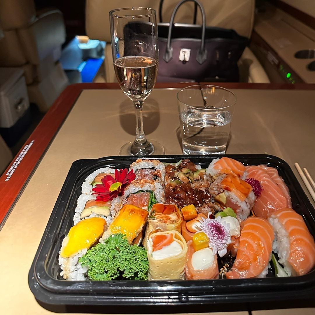 “Weekend mood”, escribió la conductora de Telefe como parte de una publicación con varías fotos. Allí se la puede ver subiendo a su avión privado, algunas fotos de sus look y el menú que eligieron para cenar: sushi y champagne.