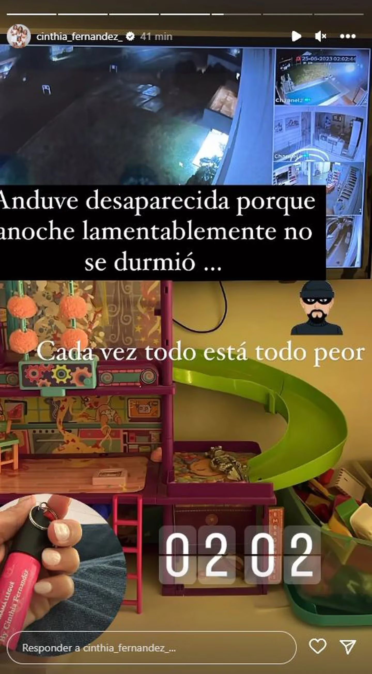 La mediática comunicó lo ocurrido a través de su cuenta personal de Instagram, donde cuenta con casi seis millones de seguidores. Allí, escribió: “Anduve desaparecida porque anoche lamentablemente no se durmió” y sumó a la publicación un collage de fotos obtenidas al revisar las cámaras de seguridad de su casa.