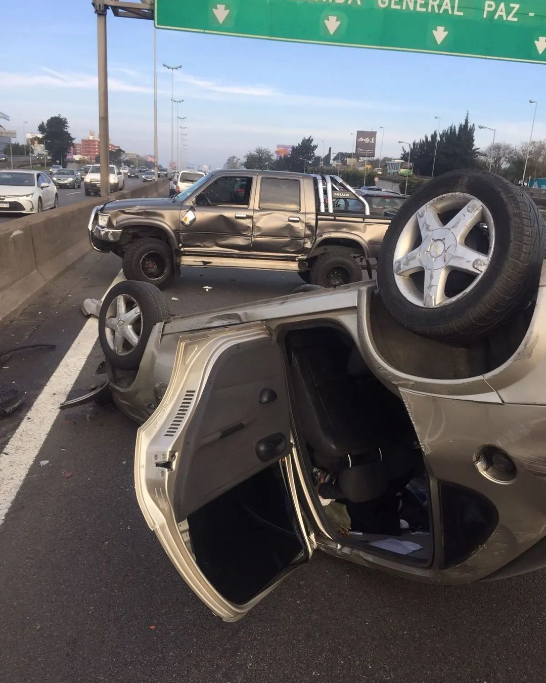 “Hoy mi hermano Carlos, el Flaco, nació de nuevo... Dios no deja de protegernos, lo de hoy fue un milagro”, expresó en su último posteo, en donde se observa el otro vehículo involucrado en el siniestro vial, una camioneta chocada, y un auto volcado en medio de la autopista.