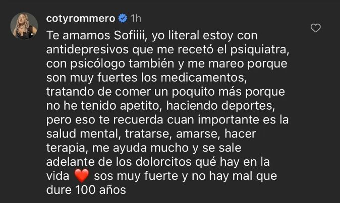 "Te amamos Sofi. Yo liberal estoy con antidepresivos, que me recetó la psiquiatra. También estoy con psicólogo. Me mareo porque son muy fuertes los medicamentos. Estoy tratando de comer un poquito más porque no he tenido apetito", comenzó expresando Coti.