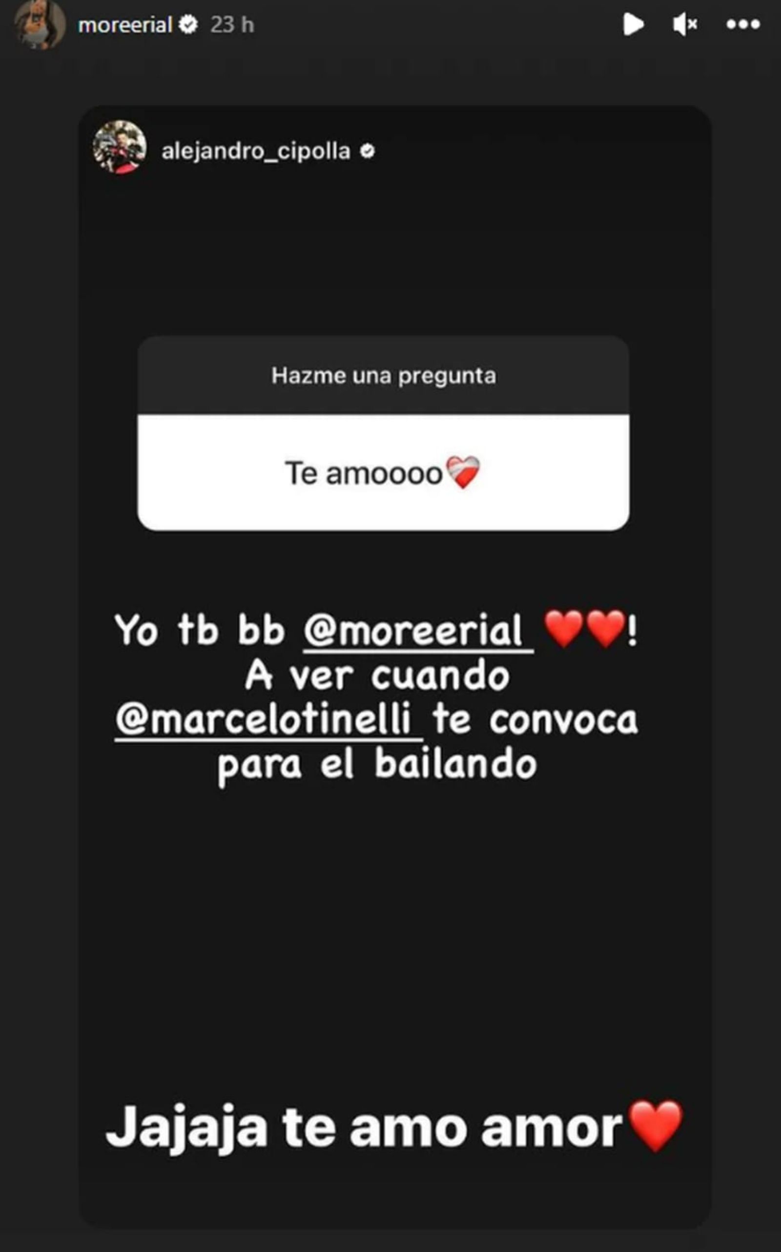 "Te amoooo" fue el mensaje que recibió Cipolla. El letrado lo compartió en su perfil de Instagram y respondió: "Yo también, bebé @Moreerial. A ver cuándo @Marcelotinelli te convoca para el Bailando".