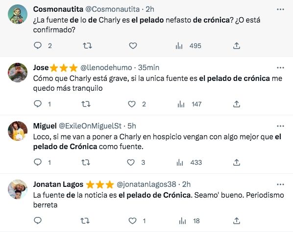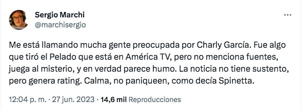 Como era de esperarse, las repercusiones no tardaron en llegar. Primero fue Sergio Marchi quien salió a desmentir la información. El periodista especializado en rock y gran amigo de Charly, además de ser el autor de la biografía definitiva sobre el músico, se volcó a las redes sociales y expresó: "Me está llamando mucha gente preocupada por Charly García. Fue algo que tiró el Pelado que está en América TV, pero no menciona fuentes, juega al misterio, y en verdad parece humo. La noticia no tiene sustento, pero genera rating. Calma, no paniqueen, como decía Spinetta", disparó de forma categórica.