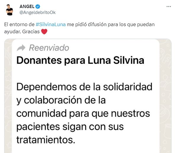 Fue Ángel de Brito quien compartió un mensaje que recibió de parte de los familiares de la modelo. "El entorno de Silvina Luna me pidió difusión para los que puedan ayudar. Gracias", compartió el conductor de LAM a través de su cuenta de Twitter.