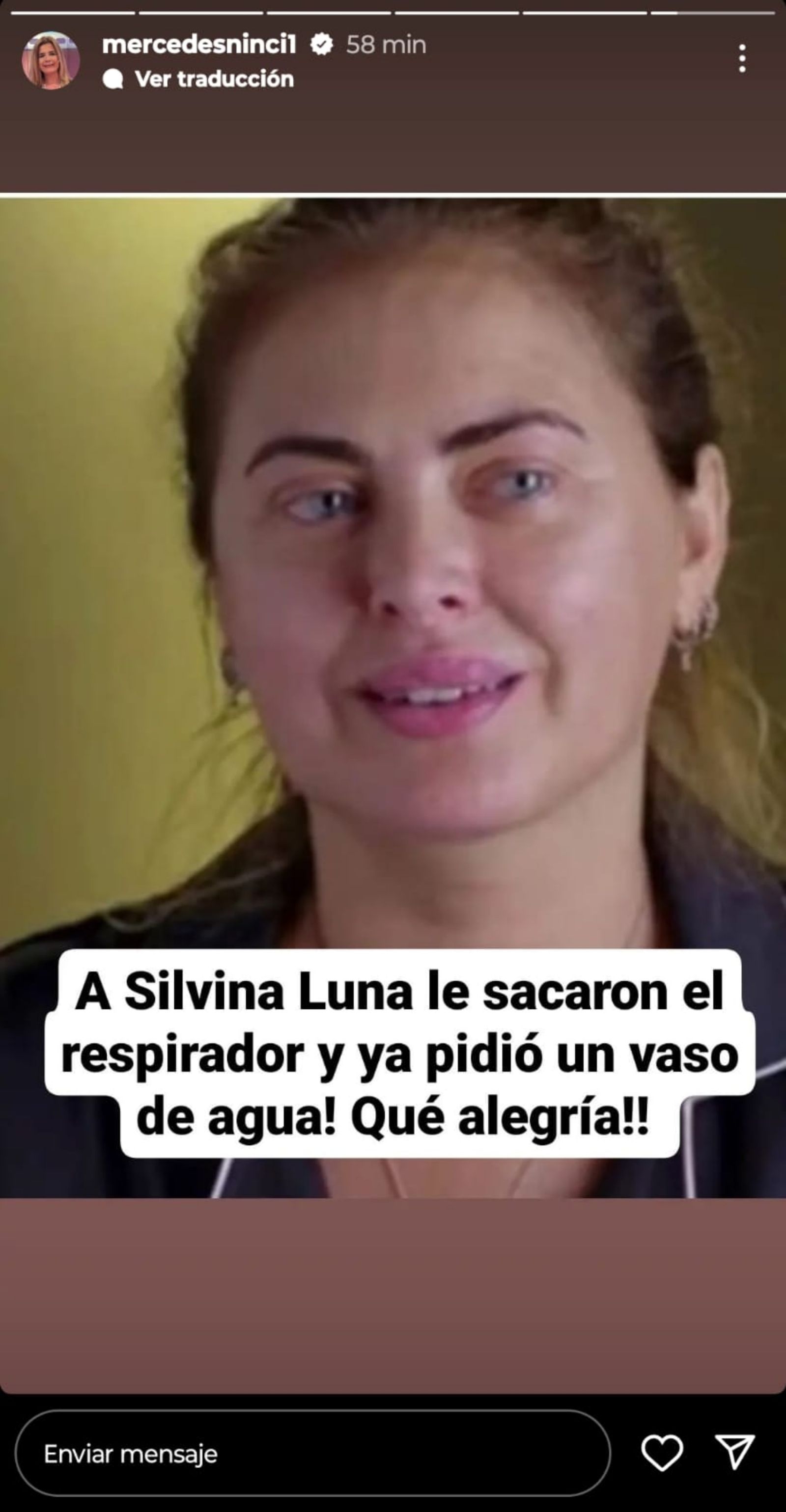 Pero las buenas noticias finalmente llegaron. Este jueves por la mañana, la periodista Mercedes Ninci comunicó a través de su cuenta de Instagram (@Mercedesninci1) un alentador dato: Silvina Luna despertó y pidió un vaso de agua.