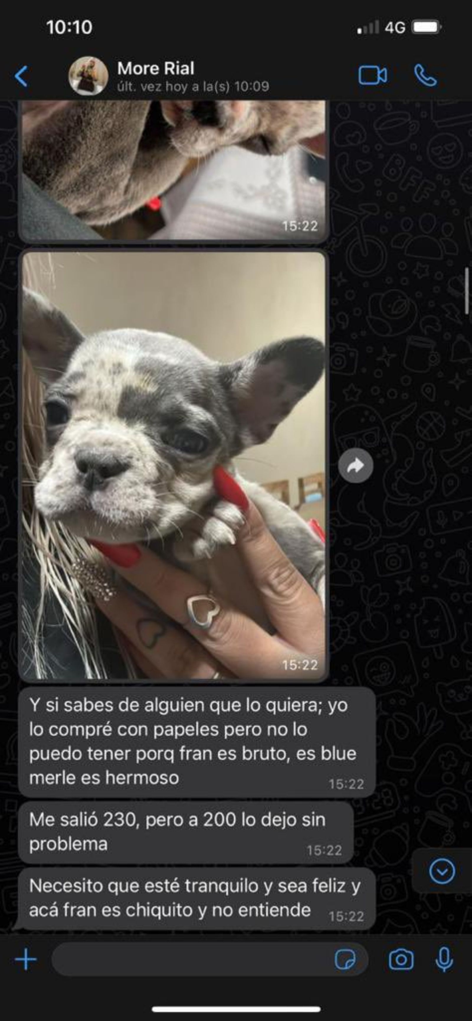 "Y si sabés de alguien que lo quiera; yo lo compré con papales pero no lo puedo tener porque Fran es bruto, es Blue Merle, es hermoso. Me salió 230, pero a 200 lo dejo sin problema. Necesito que esté tranquilo y sea feliz y acá Fran es chiquito y no entiende", son algunos de los mensajes que se pueden leer de la hija de Jorge Rial.