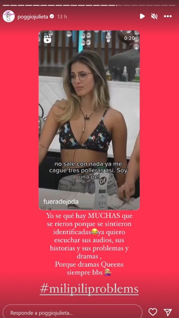 A la publicación, compartida a través de sus historias, la joven agregó en tono jocoso: “Yo sé que hay MUCHAS que se rieron porque se sintieron identificadas” y luego lanzó un pedido para la comunidad que tanto la apoya: “Ya quiero escuchar sus audios, sus historias, sus problemas y dramas. Porque dramas queens siempre, bebés. Milipili problems”.