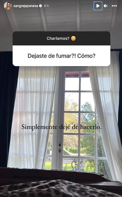 Para ilustrar la contundente frase, Eugenia sumó a la respuesta una foto de la ventana de su habitación, que cuenta con vista al jardín, en una suerte de analogía con el aire puro que, a partir de ahora, será la nueva constante en su vida libre de cigarrillos.