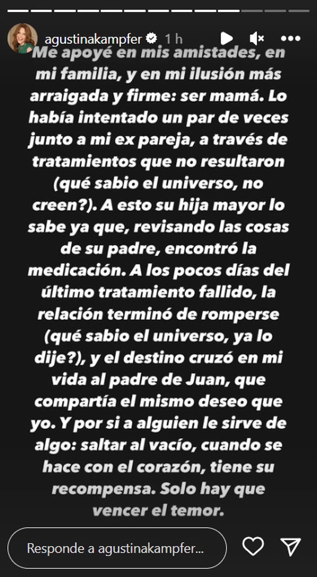 Sobre el final de su relación con Jorge Rial y lo que siguió en su vida, Agustina Kämpfer confesó: "Me apoyé en mis amistades, en mi familia, y en mi ilusión más arraigada y firme: ser mamá. Lo había intentado un par de veces junto a mi ex, a a través de tratamiento que no resultaron (qué sabio el universo, no creen?). A esto su hija mayor lo sabe ya que, revisando las cosas de su padre, encontró la medicación. A los pocos días del último tratamiento fallido, la relación ter minó de romperse (qué sabio el universo, ya lo dije?), y el destino cruzó en mi vida al padre de Juan, que compartía el mismo deseo que yo. Y por si a alguien le sirve de algo: saltar al vacío, cuando se hace con el corazón, tiene su recompensa. Solo hay que vencer el temor".