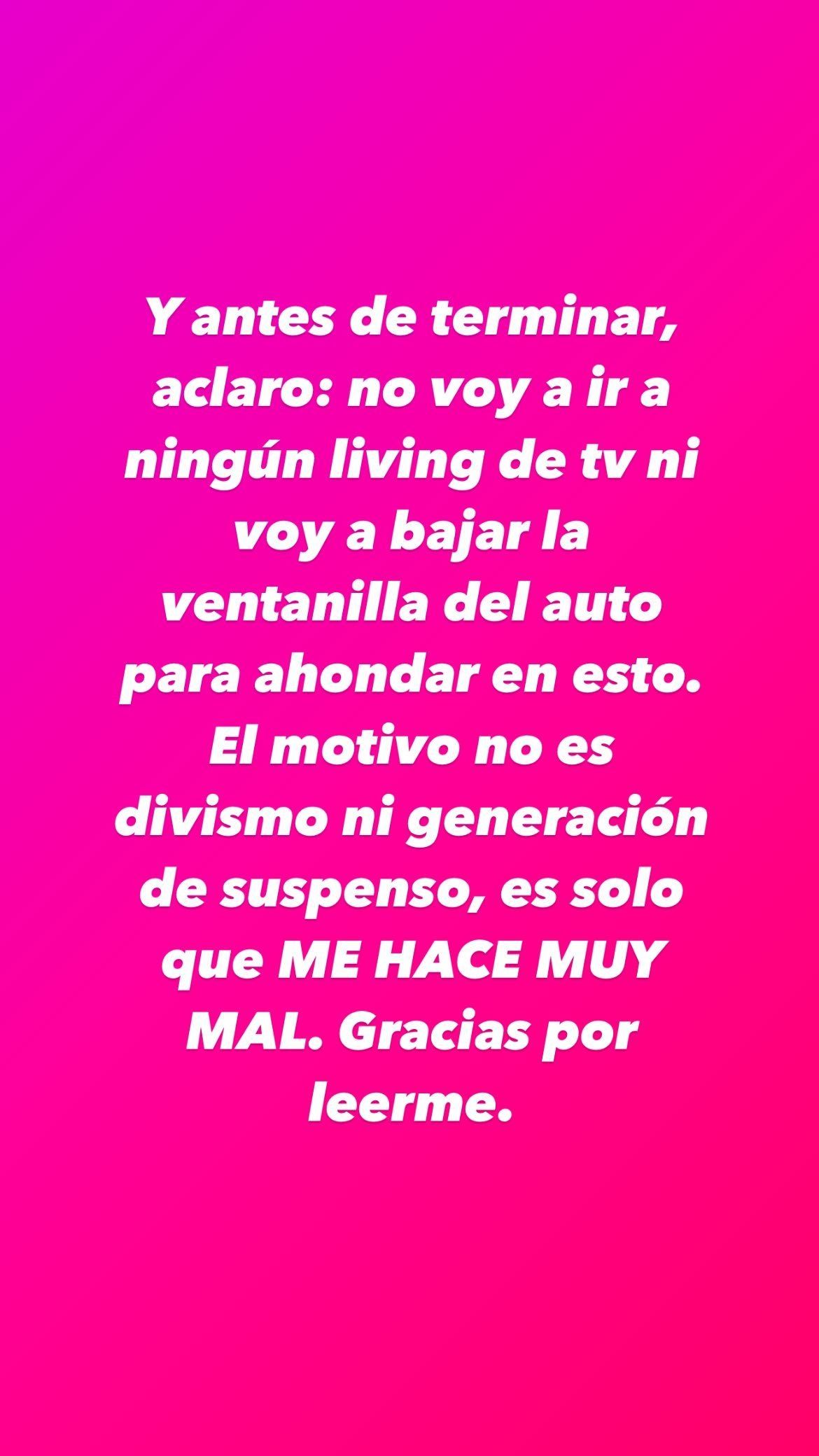Para dejar este tema aquí, y para no recibir más preguntas sobre su pasado con Jorge Rial, Agustna Kämpfer aclaró: "Y antes de terminar, aclaro: no voy a ir a ningún living de tv, ni bajar la ventanilla del auto para ahondar en esto. El motivo no es divismo ni generación de suspenso, es solo que ME HACE MUY MAL. Gracias por leerme".