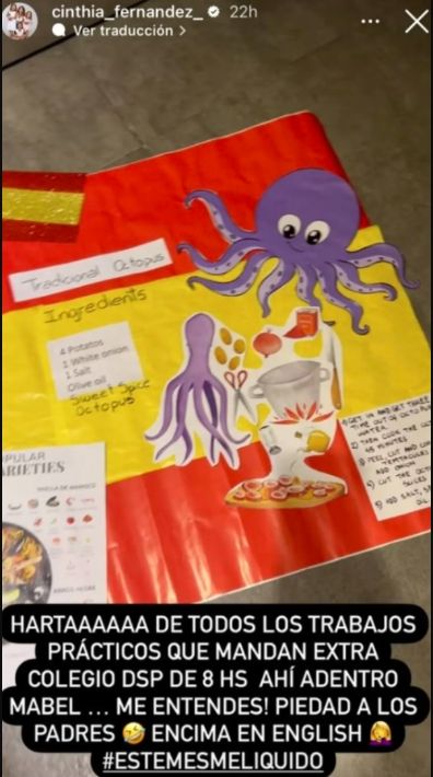 Así, Cinthia se mostró furiosa con las tareas escolares y remarcó que los trabajos prácticos que deben realizar sus nenas son en idioma inglés y que a ella le complica la vida.