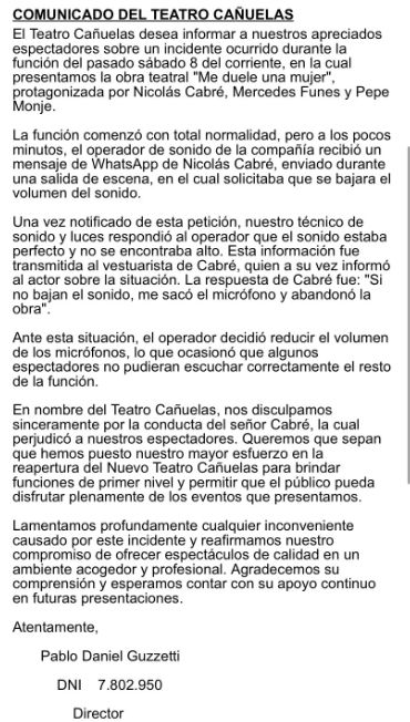 Según compartió el periodista Leo Arias, la sala acusa al actor como responsable por la pésima función del pasado sábado 8 de julio: "El Teatro Cañuelas desea informar a nuestros apreciados espectadores sobre un incidente ocurrido durante la función del pasado sábado 8 del corriente, en la cual presentamos la obra teatral 'Me duele una mujer', protagonizada por Nicolás Cabré, Mercedes Funes y Pepe Monje", comienza expresando un comunicado que compartió el teatro.
