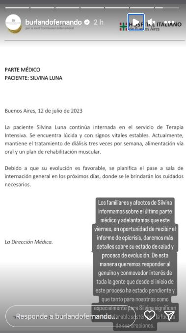 "Adelantamos que el viernes, en oportunidad de recibir el informe de epicrisis, daremos más detalles sobre su salud y proceso de evolución. De esta manera queremos responder al genuino y conmovedor interés de toda la gente que desde el inicio de este proceso ha estado pendiente", finaliza.
