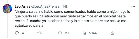 "No hablo como comunicador, hablo como amigo, hago lo que puedo es una situación muy triste, estuvimos en el hospital hasta recién. El cuadro ya lo saben todos y lo cuento siempre por acá porque me autoriza su pareja", agregó.