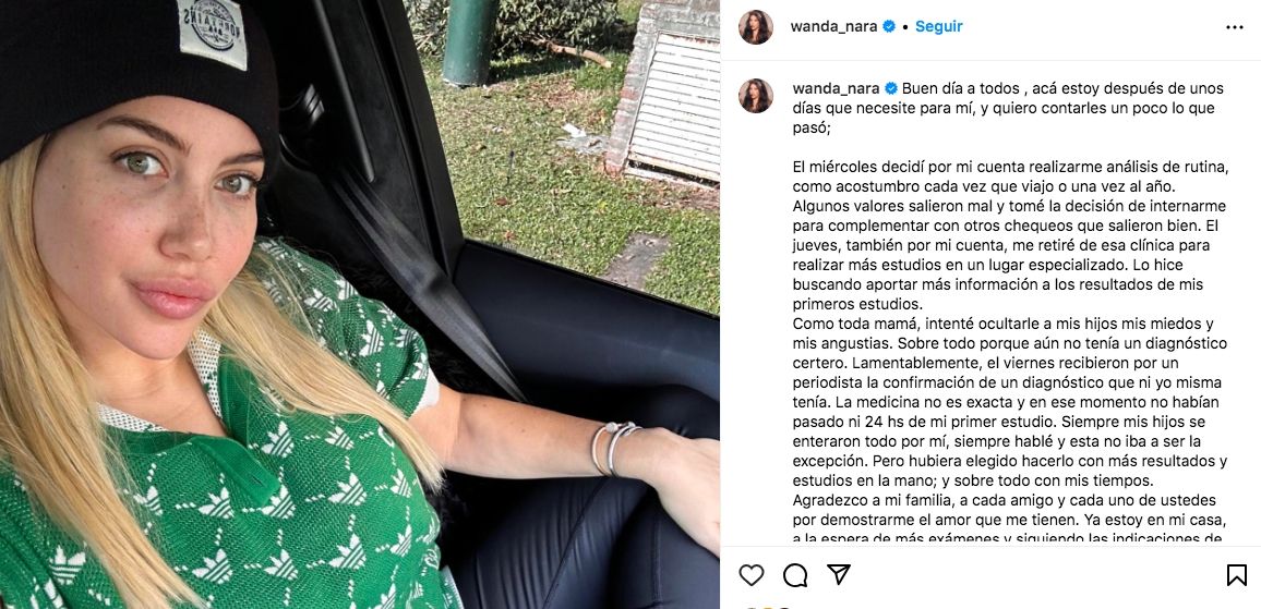 Recordemos que en la últimas horas, Wanda decidió compartir en sus redes sociales un comunicado explicando su situación de salud. "Buen día a todos , acá estoy después de unos días que necesite para mí, y quiero contarles un poco lo que pasó", comienza el posteo en su cuenta de Instagram.
