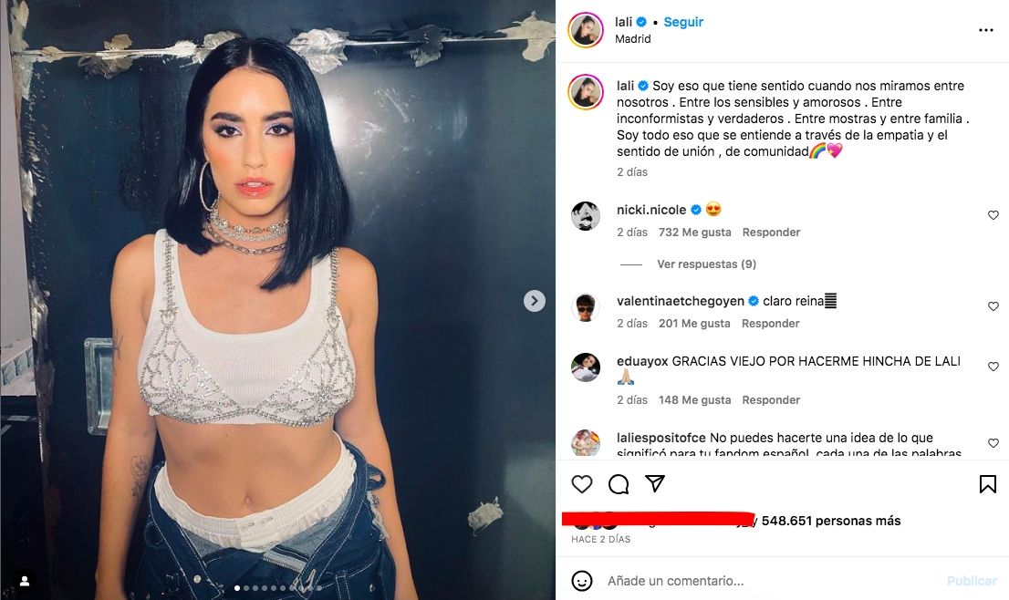 Lali Espósito se encuentra de gira por Europa. Durante su paso por España, luego de pasar por Suiza y antes de seguir la gira rumbo a Italia, la cantante aprovechó para sumarse a los festejos por el Día del Orgullo, y aprovechó para hablar sobre cómo vive su sexualidad.