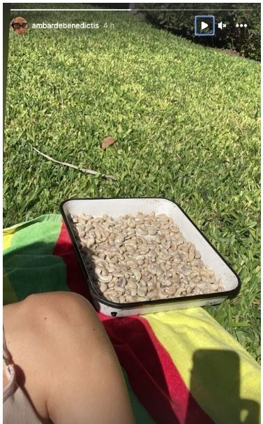 Se trata de un noble fruto seco, la castaña de cajú. De Benedictis sacó una foto de una fuente colmada de este elemento, que apoyó en el jardín de su hogar al sol. La cantidad permite dilucidar que la consume en gran volumen y que le fascina su sabor y sus beneficios.