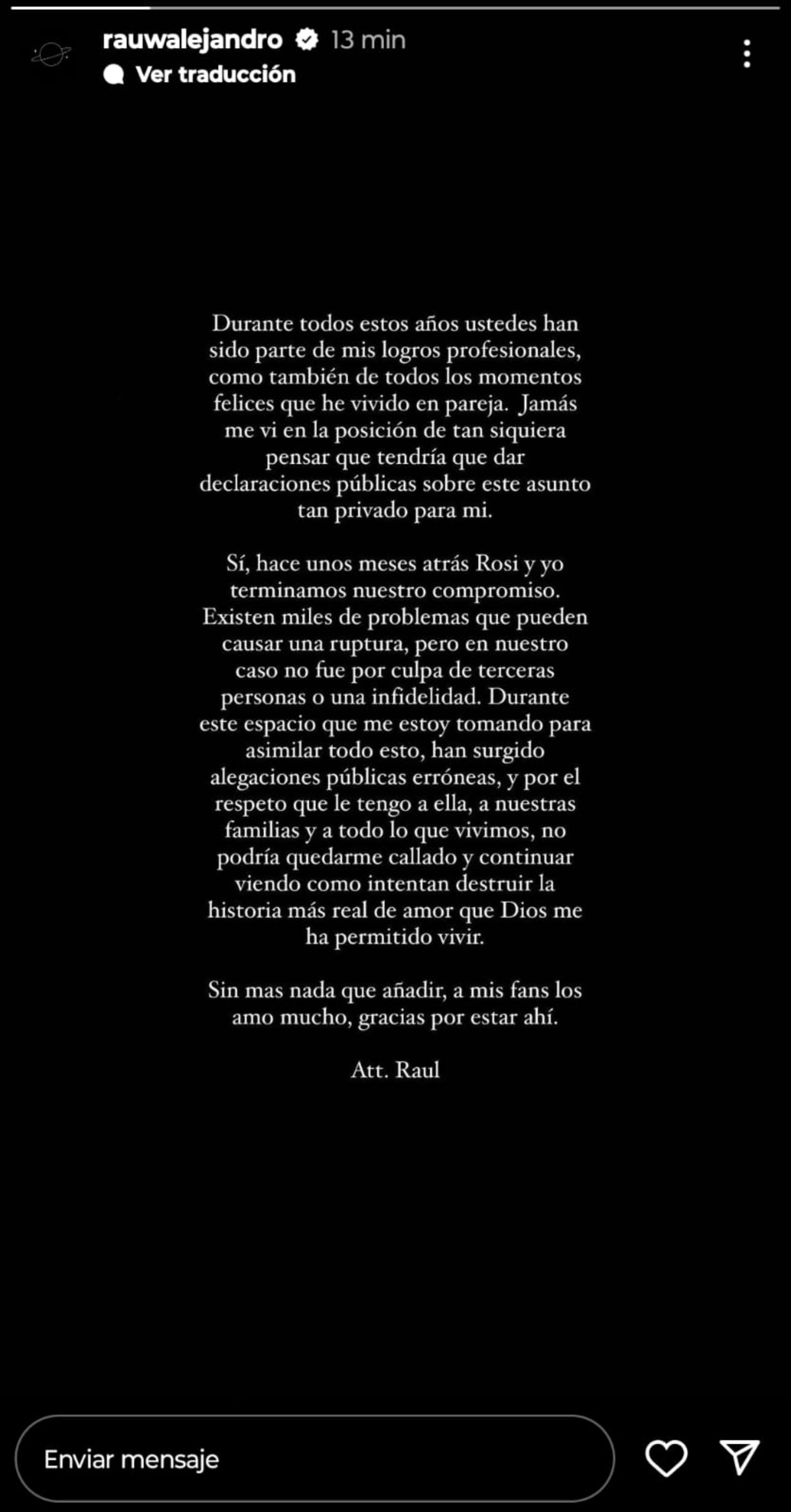 Este miércoles por la tarde (horario de Argentina), el intérprete de "Todo de ti" habló por primera vez de su separación y aclaró la situación en una historia de Instagram (@Rauwalejandro): "Durante todos estos años ustedes han sido parte de mis logros profesionales, como también de todos los momentos felices que he vivido en pareja. Jamás me vi en la posición de tan siquiera pensar que tendría que dar declaraciones públicas sobre este asunto tan privado para mi", son las primeras palabras de Rauw Alejandro en su comunicado.