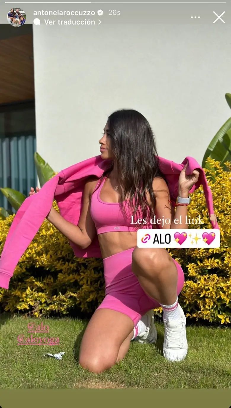 Se trata de una postal de los días en los que Antonela Roccuzzo estuvo en su casa en Funes, Gran Rosario. Allí, la empresaria optó por un look total pink, muy en la onda de Barbie, compuesto por una calza color rosa chicle, un top, zapatillas deportivas y un buzo haciendo juego.