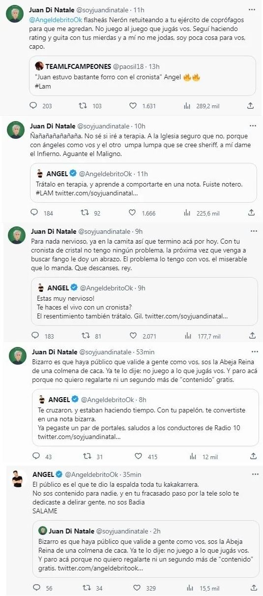 "Te cruzaron, y estaban haciendo tiempo. Con tu papelón, te convertiste en una nota bizarra. Ya pegaste un par de portales, saludos a los conductores de Radio 10", agregó el presentador de LAM. Y la historia continuó desde el lado de Juan Di Natale: "Bizarro es que haya público que valide a gente como vos. sos la Abeja Reina de una colmena de caca. Ya te lo dije: no juego a lo que jugás vos. Y paro acá porque no quiero regalarte ni un segundo más de 'contenido' gratis".