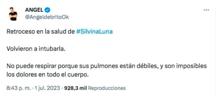 "Retroceso en la salud de Silvina Luna. Volvieron a intubarla. No puede respirar porque sus pulmones están débiles, y son imposibles los dolores en todo el cuerpo", informó Ángel de Brito desde su cuenta oficial de Twitter.