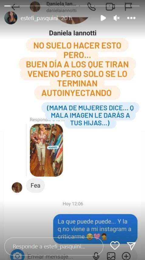 “No suelo hacer esto, pero... Buen día a los que tiran veneno, pero solo se lo terminan autoinyectando”, empezó. “‘Mamá de mujeres’ dice. Qué mala imagen le darás a tus hijas”, escribió Pasquini, señalando el modo en el que la hater se presenta en su bio de Instagram.