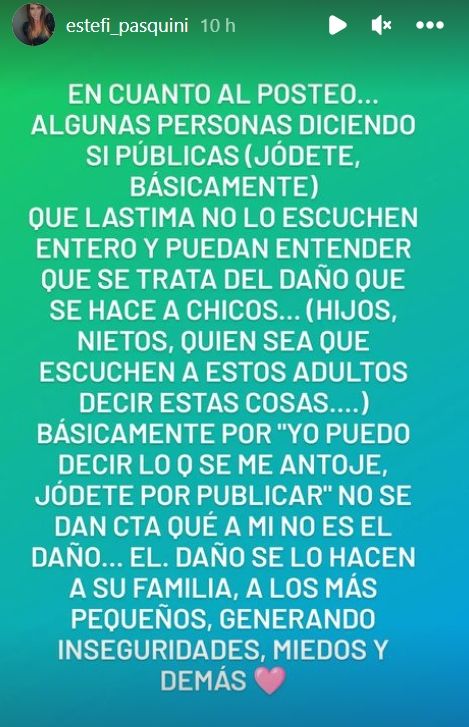 Sin embargo, el descargo de la pareja de Alberto Cormillot no se quedó acá. Ya que, horas más tarde, Estefanía grabó un video en el que cerró la idea y enfatizó en las consecuencias de mensajes como el que recibió en chicos y chicas.
