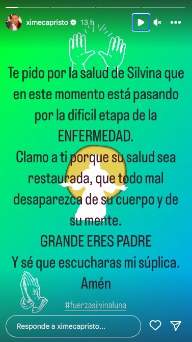 En medio de este difícil contexto, Ximena Capristo usó sus redes sociales para pedir por la pronta recuperación de su amiga: "Te pido por la salud de Silvina que en este momento está pasando por la difícil etapa de la enfermedad. Clamo a ti porque su salud sea restaurada, que todo mal desaparezca de tu cuerpo y su mente. Grande eres Padre y sé que escucharás mi súplica. Amén".