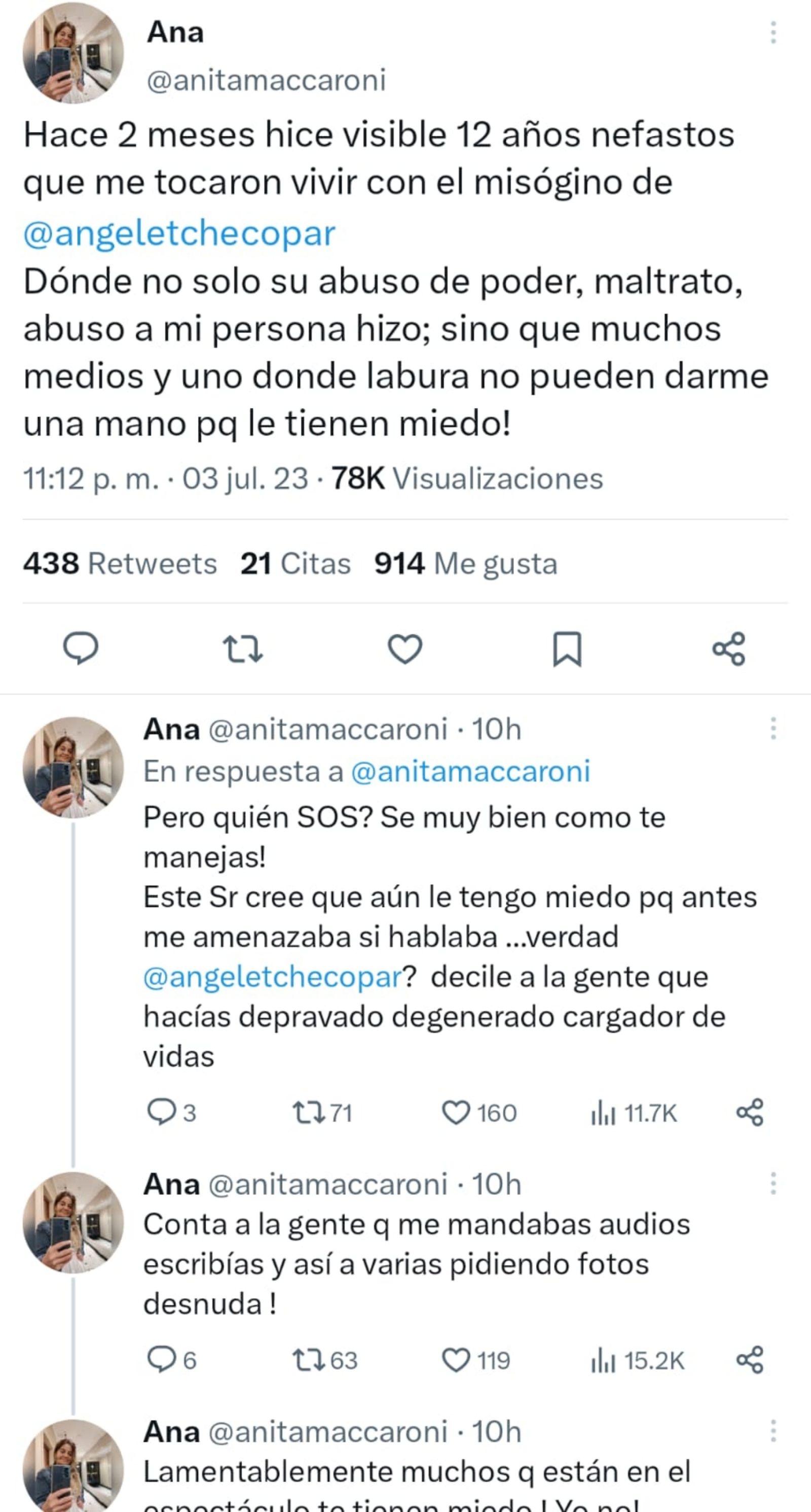 "Hace 2 meses hice visible 12 años nefastos que me tocaron vivir con el misógino de @angeletchecopar, donde no sólo su abuso de poder, maltrato, abuso a mi persona hizo; ¡sino que muchos medios y uno donde labura no pueden darme una mano porque le tienen miedo!", comenzó diciendo la locutora acerca de Baby Etchecopar.