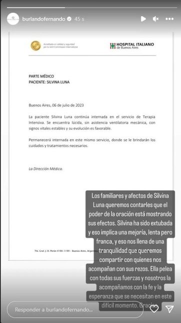 ”La paciente Silvina Luna continúa internada en el servicio de Terapia Intensiva. Se encuentra lúcida, sin asistencia ventilatoria mecánica, con signos vitales estables y su evolución es favorable”, reza el comunicado publicado en las historias de Instagram de Fernando Burlando, abogado de la ex Gran Hernano.
