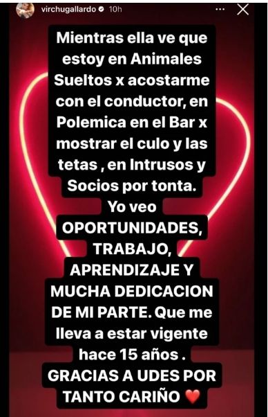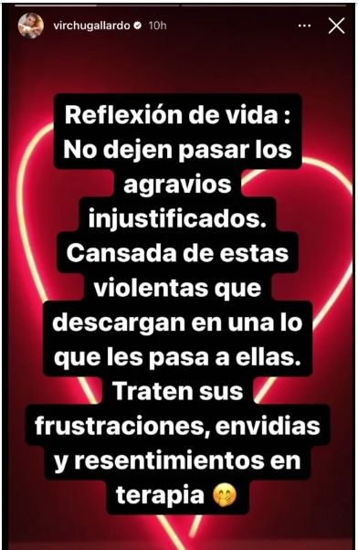 Sin nombrarla específicamente, Virginia arrancó su descargo con un llamado a la introspección, al análisis de las actitudes propias. “Reflexión de vida: No dejen pasar los agravios injustificados. Cansada de estas violentas que descargan en una lo que les pasa a ellas”, soltó.
