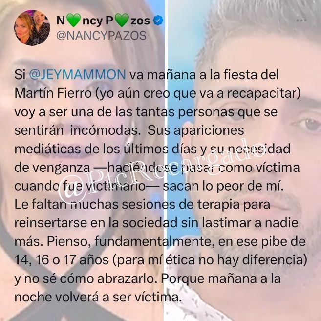 Tras las repercusiones de la noticia, Nancy Pazos publicó un fuerte mensaje desde sus redes sociales donde opinó sobre la presencia de Jey Mammon en los Martín Fierro.
