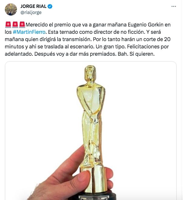 Luego, el periodista prometió dar algunos nombres de los ganadores. "Merecido el premio que va a ganar mañana Eugenio Gorkin en los Martin Fierro. Está ternado como director de no ficción. Y será mañana quien dirigirá la transmisión", anunció Rial.
