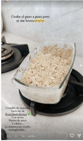 Luego, Laurita detalló las características de ese pastel: “Les muestro el crumble de manzana, la torta favorita de Claudio, con avena, harina de arroz y edulcorante. La manteca me resultó irremplazable, veremos cómo sabe”. Un gesto muy amoroso.