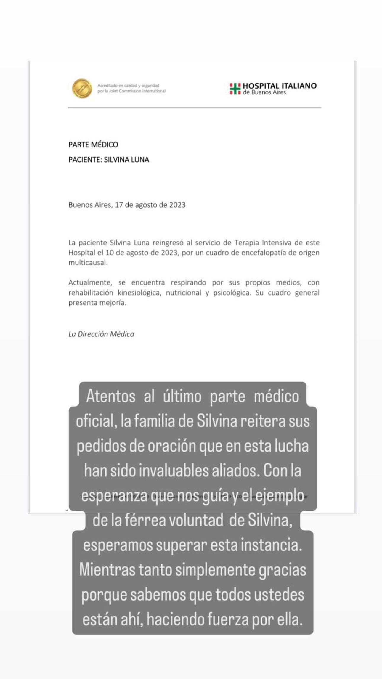 A través de sus historias de Instagram, Fernando Burlando, abogado de Silvina Luna el escrito del parte médico que dice: “La paciente Silvina Luna reingresó al servicio de Terapia Intensiva de este Hospital el 10 de agosto de 2023, por un cuadro de encefalopatía de origen multicausal. Está respirando por sus propios medios, con rehabilitación kinesiológica, nutricional y psicológica. Su cuadro general presenta mejoría”.