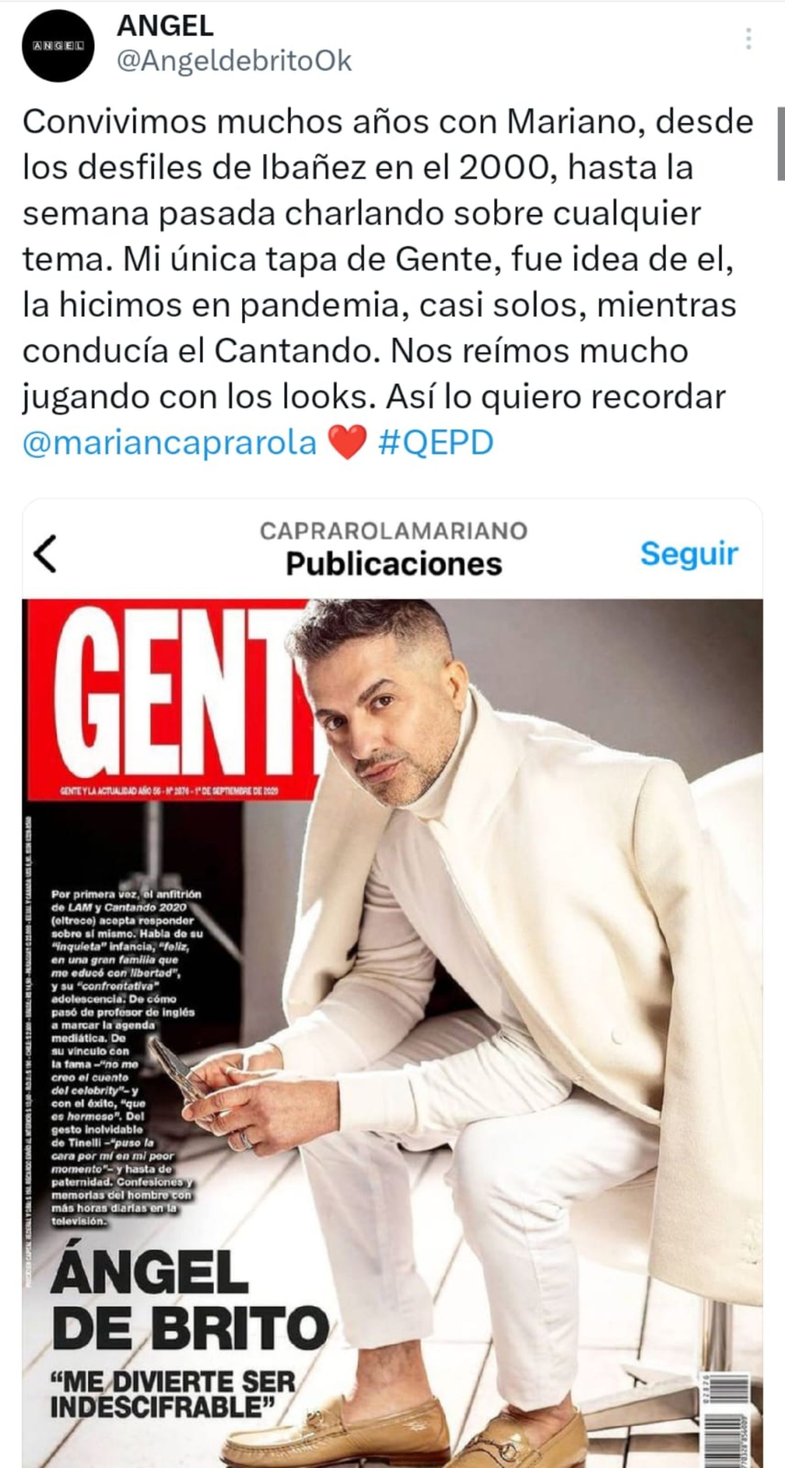 "Q.E.P.D Mariano Caprarola. ¡Fuerza a tu amada madre!", dijo Moria Casán en Twitter (X) (@Moria_Casan). Por otro lado, en la misma red social, Ángel de Brito contó cómo era su amistad con Mariano Caprarola: "Convivimos muchos años con Mariano, desde desfiles de Ibáñez (Jorge Ibáñez) en el 2000, hasta la semana pàsada charlando sobre cualquier tema, Mi única tapa de Gente fue idea de él, la hicimos en pandemia, casi solos, mientras conducía el Cantando. Nos reímos mucho jugando con los looks. Así lo quiero recordar. #QEPD",