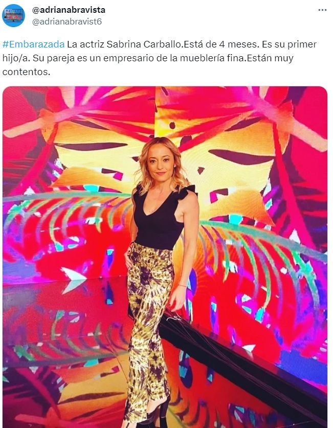 “La actriz Sabrina Carballo está de cuatro meses. Es su primer hijo/a. Su pareja es un empresario de la mueblería fina. Están muy contentos”, dio la noticia Adriana Bravista en Twitter, mientras la actriz aún no habló del tema ni confirmó la información.