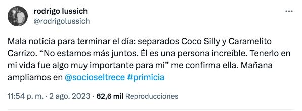 Fue el periodista Rodrigo Lussich quien anunció desde su cuenta de Twitter la triste noticia. "Mala noticia para terminar el día: separados Coco Sily y Caramelito Carrizo. ‘No estamos más juntos. Él es una persona increíble. Tenerlo en mi vida fue algo muy importante para mí’ me confirma ella. Mañana ampliamos en Socios del espectáculo", contó el periodista de chimentos.